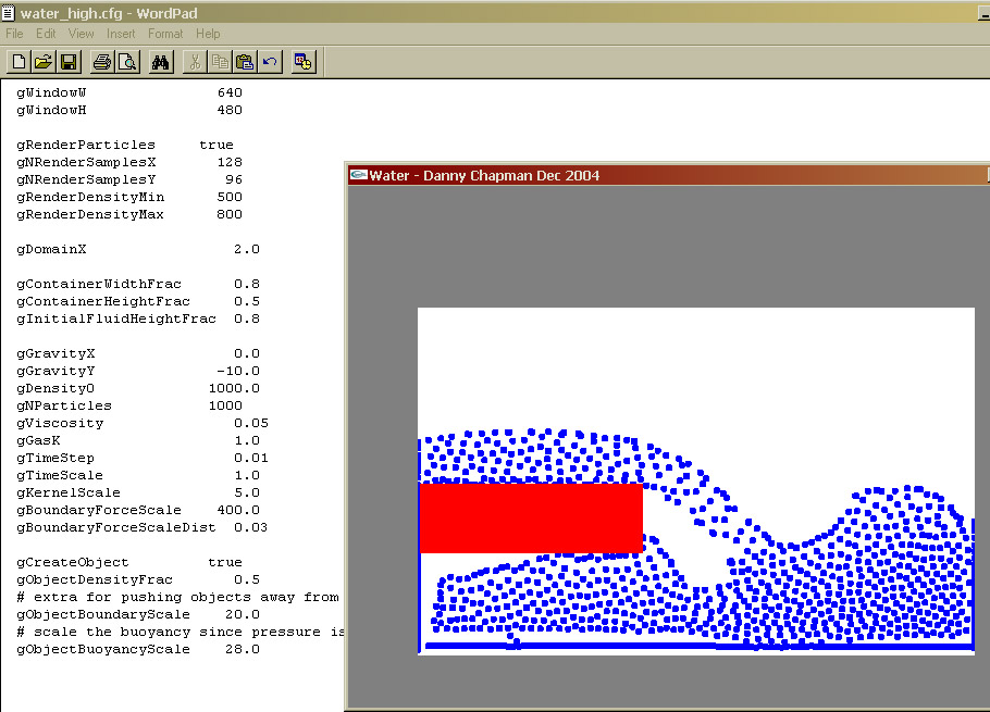 This shows the particles representing the water pouring off the rectangle (which I was just moving upwards). You can see a lot of the particles bunch up around the borders (because of the way density is calculated, and the pressure gradient is derived from density). This is a waste of particles, so solving it would make the algorithm more efficient.